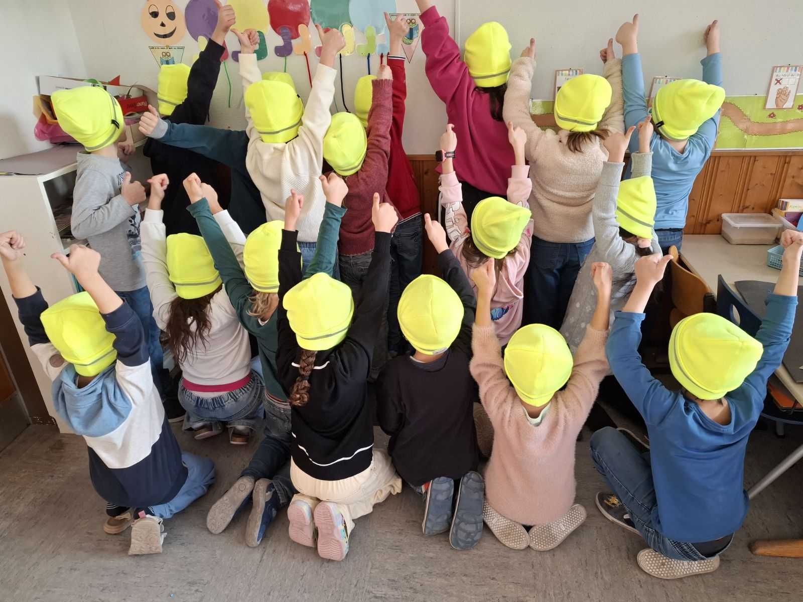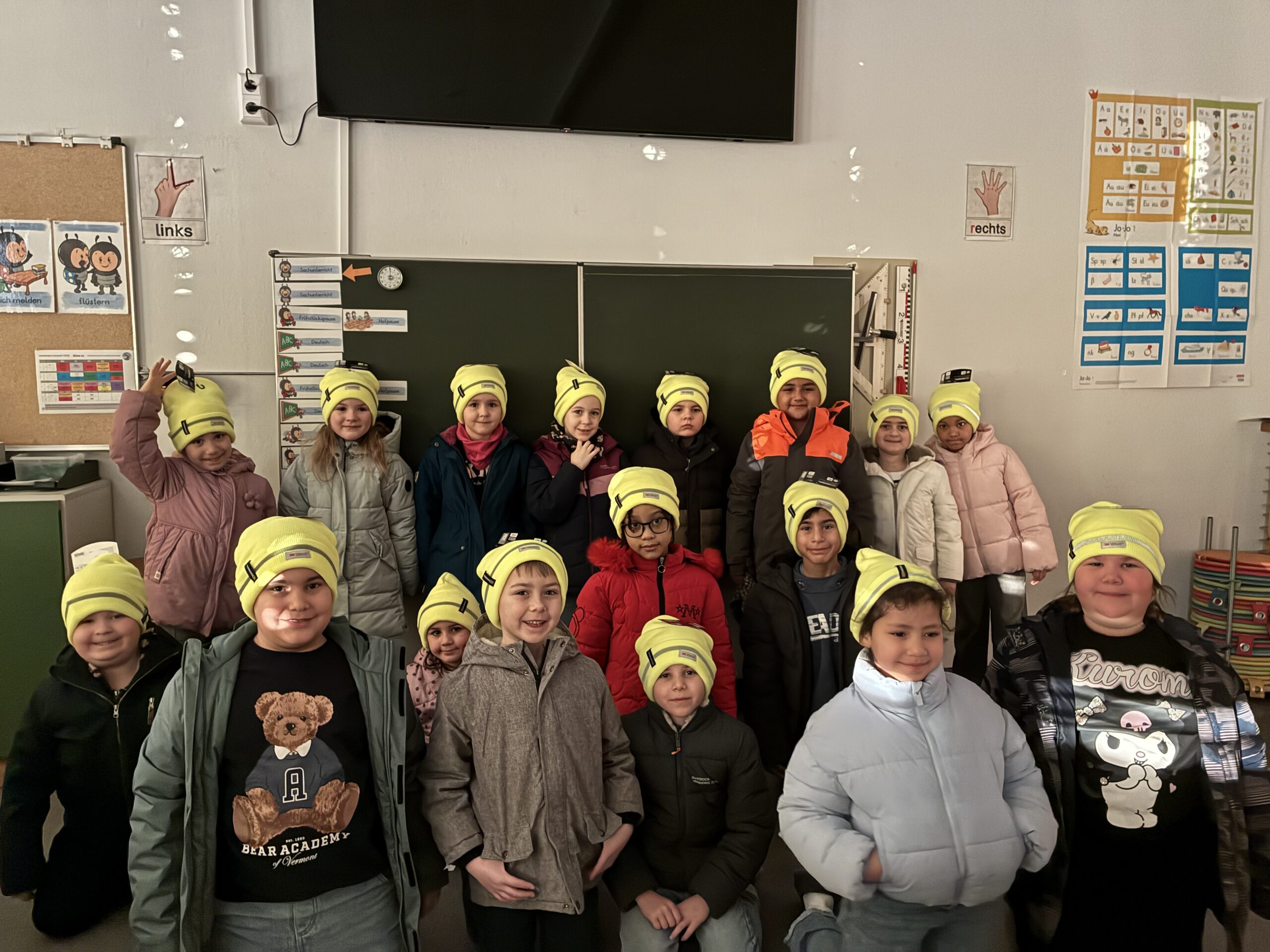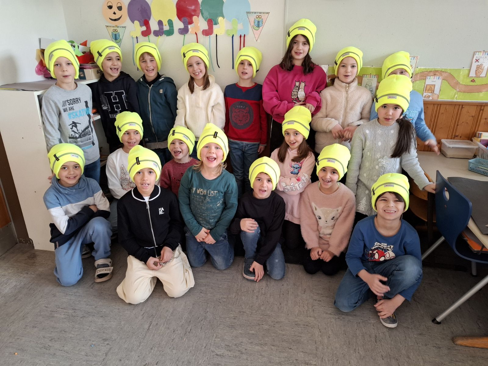 Die ersten Klassen konnten sich in dieser Woche freuen: Im Zuge der Aktion „Sicherer Schulweg – Mützen schützen“ bekam jedes Kind eine kuschelige neongelbe Wollmütze mit umlaufendem Reflektorstreifen geschenkt. Ziel der Aktion ist es, den Schulweg sicherer zu machen und für bessere Sichtbarkeit der Kinder zu sorgen. Wir sagen: Ziel erreicht! Vielen Dank für die tollen Mützen!