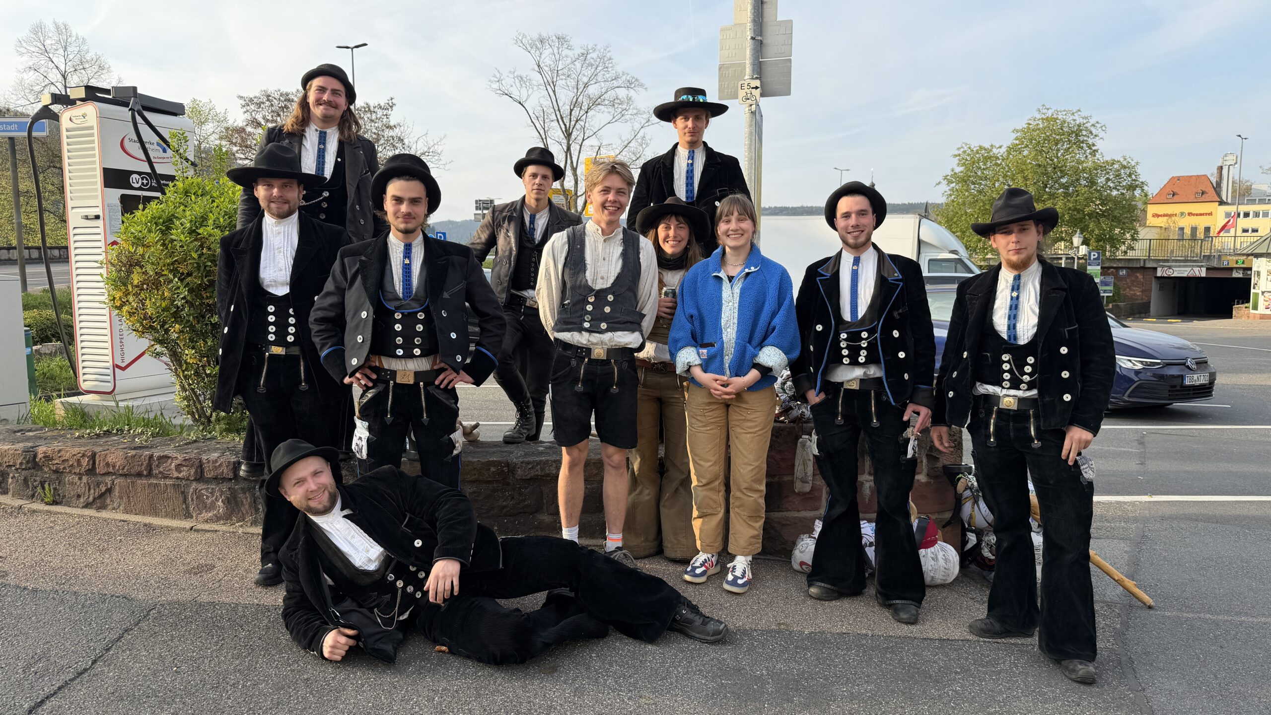 Die Begegnung kam eher zufällig zustande. Bereits am Vortag hatte Frau Pfenning in Wertheim eine Gruppe von insgesamt 19 Wandergesellen getroffen (Teile davon standen, sie Bild, auch für ein Foto bereit). Beeindruckt von ihrer traditionellen Kleidung – der sogenannten Kluft, an der man die Gesellen sofort erkennt – sprach sie die Gruppe spontan an und lud sie in den Unterricht ein. Man vereinbarte, dass – sofern sich Freiwillige fänden – einige der Gesellen am nächsten Morgen gegen 9 Uhr in den Unterricht kommen würden. Zu diesem Zeitpunkt war noch unklar, ob der Besuch tatsächlich zustande kommen würde, denn die Gruppe hatte sich getroffen, um einen ihrer Kameraden nach dreijähriger Wanderschaft auf seinem letzten Stück nach Hause, nach Tauberbischofsheim, zu begleiten.