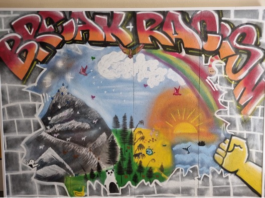 Weiterhin gestalteten Schülerinnen und Schüler der GMS Wertheim ein eindrucksvolles Graffiti mit der Botschaft „Break Racism“. Das Kunstwerk zeigt auf kreative Weise, wie Mauern des Vorurteils eingerissen werden: Dahinter entfaltet sich eine vielseitige, bunte Natur mit Tieren, Bergen, Sonne und Regenbogen – ein Bild für Hoffnung, Zusammenhalt und Vielfalt. Der kraftvolle Schriftzug ermutigt dazu, Barrieren abzubauen und ein offenes, buntes Miteinander zu leben. Mit viel Engagement und Teamwork entstand so ein starkes, dauerhaft sichtbares Zeichen für Zivilcourage und gegen Diskriminierung, das unsere Botschaft auch im Alltag immer wieder ins Bewusstsein ruft.